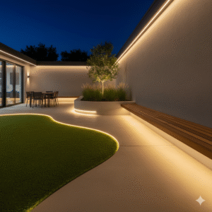 - Debajo de bancos o escalones: Crean un efecto flotante espectacular y aportan seguridad.